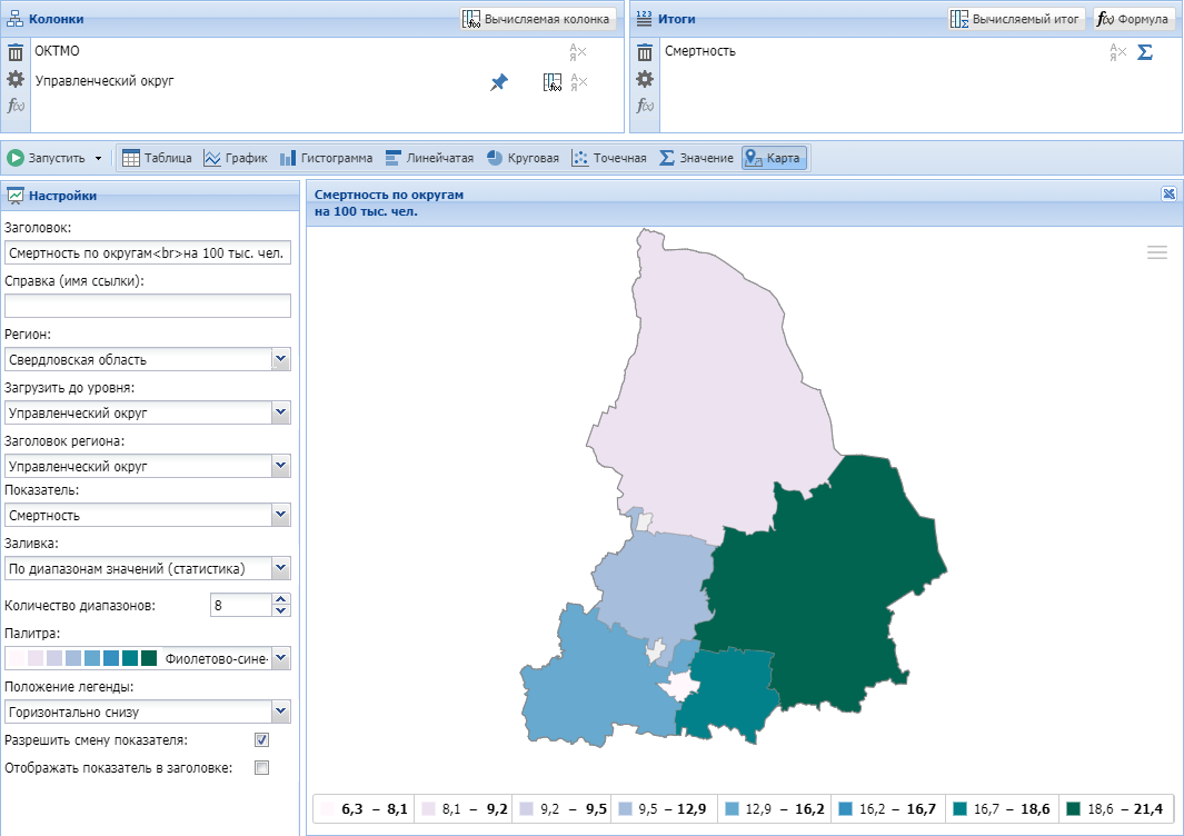 Цвет диапазона определяется градиентом, который строится в соответствии с выбранными Цветом минимума и Цветом максимума. Территории имеют заливку в соответствии с цветом диапазона.
