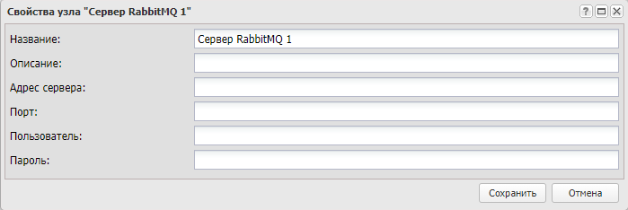 Узел "Сервер RabbitMQ" позволяет настроить подключение к серверу очередей RabbitMQ.